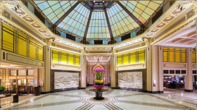 上海和平饭店,装饰艺术风格的力作。 历经三年的精心修缮,复古魅力在这里重新焕发耀眼光辉。位于著名的外滩和繁华的南京路交汇处,这里成为领略上海迷人风情和生机的绝佳地点。这座备受尊崇的地标性建筑曾是上海精英阶层的豪华娱乐场所,奢侈的庆典活动和地道的巴黎时装秀每晚都在这里上演。酒店270间富有装饰艺术风格、装潢典雅的客房及39间套房将现代化科技和奢华舒适的下榻设施相结合,呈现无以伦比的和平之旅。