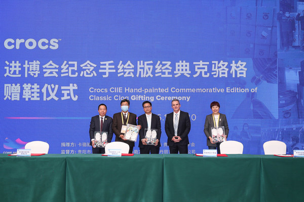 对于此次具有重要意思的赠鞋仪式,Crocs全球副总裁、大中华区总经理Frankie Taylor表示:“十分荣幸在进博局的见证下与贵阳红十字会建立深厚的友谊。此次我们特别定制了进博会纪念手绘版经典克骆格,将可爱憨人的熊猫‘进宝’、活泼可爱的‘苗女’、红十字会标识进行不同组合,搭配以‘进宝’为灵感特别定制的智必星赠与合作伙伴,满载Crocs的爱心和对公益及进博的热情,表达我们对未来的美好期望。”