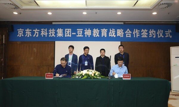 北京2020年10月9日 /新闻稿网 - Xinwengao.com/ — 11月9日,豆神教育(Shenzhen:300010)与京东方在京签订战略合作协议,豆神教育董事长池燕明、副总裁杨深,京东方集团执行副总裁、京东方艺云科技董事长姚项军等出席签约仪式。双方将结合各自资源与优势,共同打造软硬融合的智慧终端和教育解决方案,开拓教育行业市场,通过长期全方位合作实现共赢。