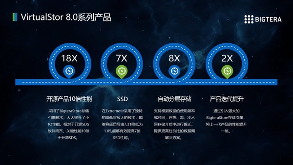 VirtualStor 8.0系列产品是大兆科技产品线的全新迭代升级,采用了BigteraStore存储引擎技术,大大提升了小IO性能,相对于开源SDS软件而言,关键性能10倍于开源SDS。同时支持根据数据的使用频率或时间,在热、温、冷不同存储介质中进行搬迁,提供更高性价比的数据湖解决方案。在产品更新之出接受了国内外专业存储媒体的评测,分析数据抢占了领先地位。