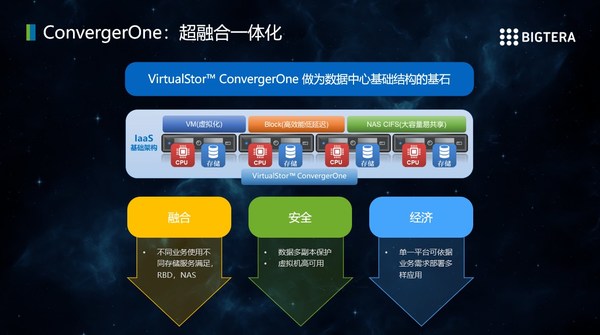 ConvergerOne整合了虚拟化和分布式存储功能,是装机即就绪的基础架构。适合各企业或学校研究室部署各种应用或作为研发测试的实验环境,解决一般需要分开采购服务器和存储系统的问题。并在应用程序的规模需要扩充时,能横向扩容节点,以增加所需的计算或存储资源,完全可以作为数据中心基础结构的基石。