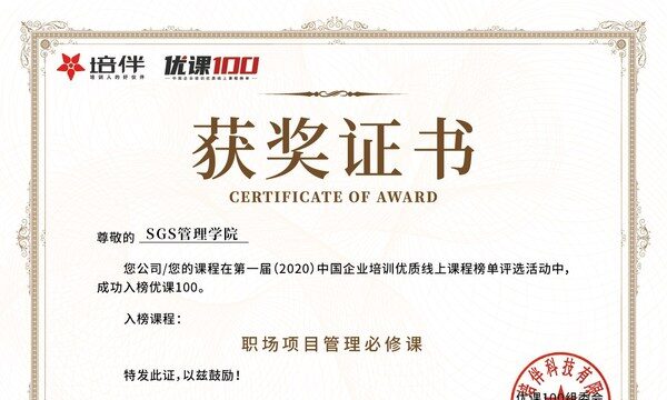 广州2020年11月30日 /新闻稿网 - Xinwengao.com/ — 日前,2020年度“优课100中国品牌优质线上课程榜单”评选圆满结束。经过层层筛选与激烈角逐,SGS管理学院的《职场项目管理必修课》荣登榜单。