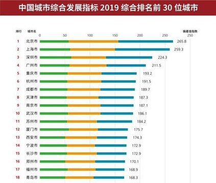 “中国城市综合发展指标2019”综合排名前十名的城市分别是北京、上海、深圳、广州、重庆、杭州、成都、天津、南京和武汉。这10个城市分布在5个城市群,其中长三角城市群3个城市、珠三角城市群2个城市、京津冀城市群2个城市、成渝城市群2个城市、长江中游城市群1个城市。