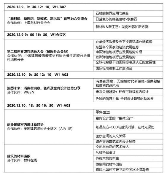SURFACES China 2020 现场会议及活动以“材料赋能设计,打造未来生活”为主题,演讲嘉宾云集建筑师、知名设计事务所设计总监、行业专家、趋势分析师等业内大咖,通过专题演讲、交流互动、案例分享等多种形式,帮助您深入了解消费者市场新动向、未来设计趋势以及材料应用的发展方向。