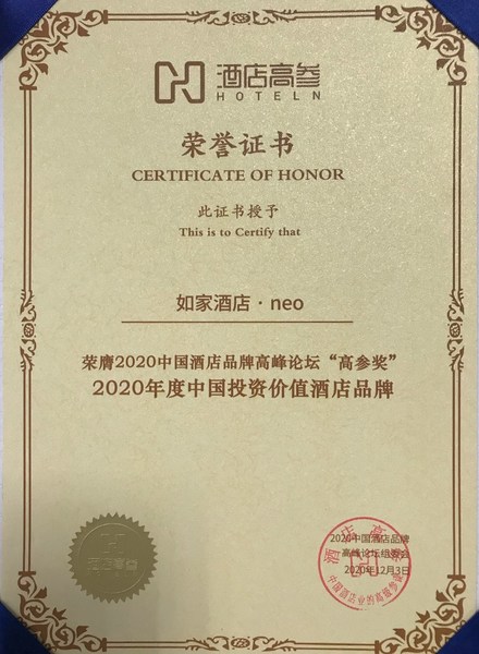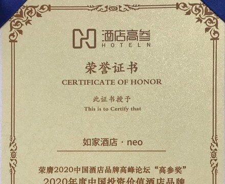在由酒店高参主办的 “2020 中国酒店品牌高峰论坛暨第五届高参奖颁奖典礼”上,如家酒店•neo获得这一奖项。高参奖是酒店高参联合第三方权威数据机构,通过大众评委与专业评委两种方式,为行业与消费者提供有价值的榜单,表彰对行业有影响力的酒店品牌。峰会以“重生·振兴”为主题,探讨新形势下中国酒店行业发展的新趋势。