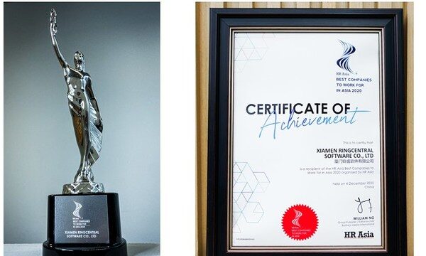中国厦门2020年12月11日 /新闻稿网 - Xinwengao.com/ — 12月4日,“2020亚洲最佳企业雇主奖(中国区)” (HR Asia Best Companies to Work for in Asia ®)正式揭晓。RingCentral铃盛再次荣获HR Asia“亚洲最佳企业雇主奖”。因疫情原因,今年的颁奖典礼全程在线上进行。中国区的获奖企业包括KPMG、Maersk、金佰利等国际知名企业。