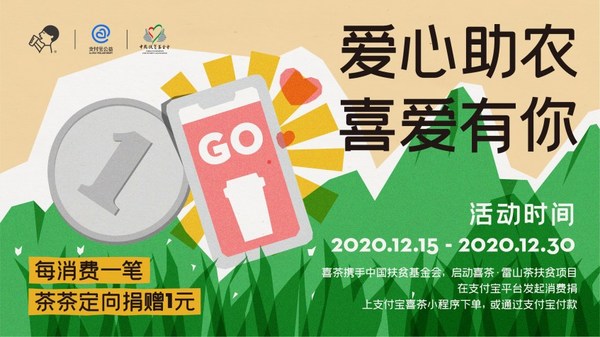 深圳2020年12月18日 /新闻稿网 - Xinwengao.com/ — 12月15日,喜茶携手支付宝在全国门店启动“爱心助农·喜爱有你”消费捐活动 — 消费者每消费一笔,喜茶将代表消费者捐出爱心1元。活动将捐赠总金额100万人民币,用于与中国扶贫基金会在贵州省雷山县开展茶产业扶贫项目。