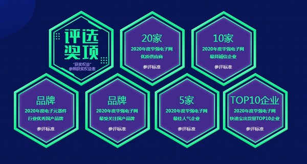 本届评选活动将以“产业互联创享芯未来”为主题,共设置六个实力品牌奖项,分别是“2020年度华强电子网优质供应商”20家、“2020年度华强电子网最具诚信企业”10家、“2020年度电子元器件行业优秀国产品牌”奖项、“2020年度华强电子网最受关注国产品牌”奖项、以及“2020年度华强电子网最佳人气企业”5家(由网络投票选出)、“2020年度华强电子网快递宝出货量TOP10企业”(2020年快递宝服务累计下单数排名前10的供货商)。专家评审团将根据提名企业的资质初评300家企业入围,共同角逐荣誉奖杯!诚邀广大电子元器件行业企业参与我们的评选活动,共同见证优秀企业的发展历程。