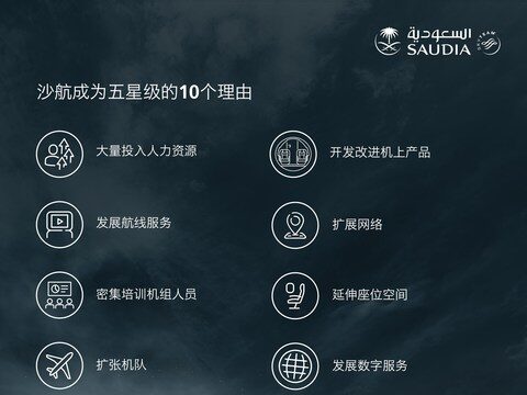 沙特阿拉伯航空公司总干事易卜拉欣·奥马尔(Ibrahim Al-Omar)阁下对这一殊荣发表评论时表示:“沙航的整个团队都始终牢记使命,每一步都提供一流的服务。 我们正在重新定义尊贵的客人与我们一同体验空中旅行的方式,也很自豪地看到,我们这场旅程至今为止已经发生了极大的改变。”