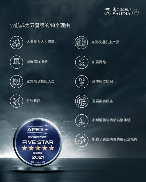 APEX 首席执行官 Joe Leader 博士则说:“祝贺沙特阿拉伯航空升格成为 APEX 2021五星级国际航空公司,经过 TripIt® 独立验证的沙特旅客选择了你们,这也是经过千百架次航班考验后的结果。”