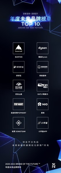 综合大众评审和专家评审的投票,由学术组、品牌高层组、品牌营销解决方案组、产品设计组共计30位评审经过对品牌素材的严谨考量,综合投票期成绩共同评选出年度未来品牌TOP10。