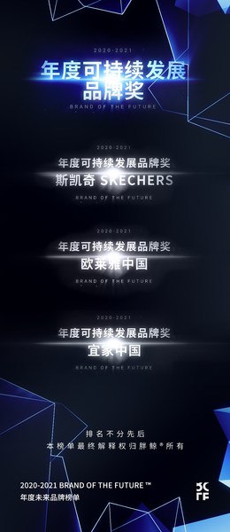 在本次的2020-2021年度未来品牌年度榜单中,胖鲸新设了可持续发展品牌价值奖,关注在可持续发展领域有卓越成就,同时也在品牌与商业价值上有明确关联体现,为其所在行业起到引领性作用的品牌。获奖企业为:欧莱雅中国、斯凯奇 SKECHERS、宜家中国