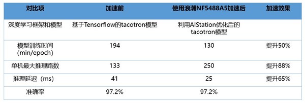 中科极限元开发的智能语音交互解决方案在国内处于领先水平,广泛应用于教育、交通、呼叫中心、智能硬件等多个领域,本次在浪潮NF5488A5进行加速。NF5488A5高性能、高带宽、易部署的特性极大地促进了智能语音模型训练及线上推理。测试数据显示,在相同准确率下,与原有的系统相比,NF5488A5将模型训练速度提升了50%,单机最大推理路数提升88%,推理延迟提升65%。