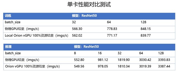 趋动科技与浪潮联合打造了业内领先的一体化GPU资源池化解决方案。本次测试采用TensorFlow框架的Benchmark,测试小模型推理、大模型训练等多种AI应用场景,验证趋动科技OrionX AI加速器资源池化方案对浪潮NF5488A5的兼容性和性能。结果表明,NF5488A5服务器性能优异,部署资源池化方案后,本机性能损耗小于1%,对比以往服务器的GPU性能,数据提升近50%。