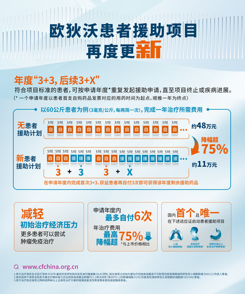 肺癌、胃癌、头颈鳞癌患者药物可及性进一步提高 上海2020年12月24日 /新闻稿网 - Xinwengao.com/ — 中国癌症基金会(CFC)今日宣布,“欧狄沃患者援助项目”援助方案将再次更新,方案由原来的“首次3+3,后续3+4循环”调整为年度“3+3,后续3+X”,即符合项目标准的患者,在申请年度内最多自付6次欧狄沃的治疗费用,便可获得该申请年度内剩余的所有药品援助,患者可按申请年度重复发起援助申请,直至项目终止或疾病进展。在新方案下,患者年自付比例较上市价格最高降幅超75%,治疗疾病的经济负担进一步降低。 作为首个且目前唯一获批用于二线非小细胞肺癌[1]、含铂治疗进展头颈部鳞癌[2]和经两次或以上全身治疗晚期胃癌[3]的PD-1抑制剂,欧狄沃是目前国内唯一一个在上述三个适应证中启动患者援助项目的免疫肿瘤药物。此次调整后,获益患者仅需支付上市价格的1/4即可在全年使用进口免疫肿瘤治疗药物,创新药物的可及性将进一步提高,更多患者有望实现高质量的长期生存。 调整后的患者援助方案将于2021年1月1日起正式实施,凡符合条件的低收入患者可依据要求和流程提出申请。调整后项目申请材料的详细要求及具体项目流程请关注中国癌症基金会官网信息(www.cfchina.org.cn)。 减轻初始治疗压力,降低全年治疗费用 秉承中国癌症基金会的一贯宗旨,为进一步提高创新肿瘤药物的可及性,在援助方百时美施贵宝的支持下,基金会对欧狄沃患者援助项目进行了多次调整。今年年初,患者初次治疗的经济门槛得以降低,让更多患者能够尝试创新的肿瘤免疫治疗,获得长期生存机会。时隔几月,项目再次调整,有望进一步减轻患者在治疗过程中所面临的经济压力,提高用药可及性。 中国癌症基金会理事长赵平教授表示:“近年来,免疫肿瘤治疗作为一种创新治疗方式为患者提供了新的治疗选择。尽管原有的患者援助项目在一定程度上减轻了患者的经济压力,但依然有患者因为经济原因无法完成长期规范化的治疗。更新后的方案在减轻初始治疗经济压力的基础上,进一步降低患者的全年治疗费用,让获益患者能够持续获得援助药品,不因经济原因而放弃治疗,最大化免疫治疗效果。” 患者接受欧狄沃治疗的时候可根据个人情况选择按公斤体重(3毫克/公斤),或固定剂量(240毫克)进行给药。若采用公斤体重的方式,以60公斤的患者为例,患者完成一年治疗(每两周一次)自付费用约为人民币479,492万元,而在新方案中,患者年自付费用为人民币110,652元,约为上市价格的1/4。 多方协力,共同提升患者用药可及性 恶性肿瘤已成为严重威胁人民健康的主要公共卫生问题之一,国家癌症中心最新统计数据显示,恶性肿瘤发病率每年以3.9%的速度递增[4]。面对持续高发的癌情,传统的治疗手段无法满足患者日益增长的治疗需求,免疫肿瘤治疗作为创新治疗方式为患者带来了长期生存的新希望。 2018年6月,欧狄沃在中国获批上市,成为首个登陆中国的免疫肿瘤药物,开启了肿瘤治疗的新篇章。然而,作为一种创新性的治疗手段,即便开展患者援助项目,仍有患者在治疗过程中面临着较大的经济压力。为改善这一现状,社会各界正在共同努力,探索创新支付模式,通过构建多层次的医疗保障体系提升患者对于创新药物的可及性。 百时美施贵宝中国大陆及香港地区总经理陈思渊女士表示:“秉承对中国的长期承诺,百时美施贵宝于近期制定了‘中国战略2030’计划,除了加速将全球创新药物带入中国外,公司还将积极与政府及相关合作伙伴紧密协作,通过创新的准入模式和差异化的患者支持服务进一步提升欧狄沃在中国的可及性。截至目前,已有46个城市将欧狄沃纳入地方补充医疗保险或商业保险,其中珠海、佛山、广州、大连、苏州等11个城市允许患者带病参保。相信在大家的共同努力下,患者未来能够以更合适、快速和可持续的方式提升创新药物的可及性。”