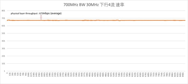 基于700MHz N28 频段下带宽30MHz,采用4T4R的无线设备, 利用下行4流技术,使得小区峰值下载平均速率可达到673Mbps。下行4流采用码本的SU-MIMO方案。在实际环境中,可根据无线条件动态进行不同流数调整,达到无线条件允许条件下的最优速率。未来在得到商用终端和CPE等设备的广泛支持后,此技术也将得到广泛应用。