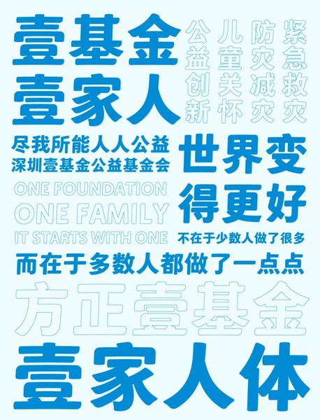 深圳2021年1月12日 /新闻稿网 - Xinwengao.com/ — 2021年1月11日,由深圳壹基金公益基金会与方正字库联合开发的国内第一款公益品牌联名字体 — 方正壹基金壹家人体正式发布,壹基金与方正字库跨界合作、同聚爱心,通过字体赋能公益,积极践行公益新主张。 作为国内最早成立的民间公募基金会之一,壹基金以“尽我所能,人人公益”为愿景,专注于灾害救助、儿童关怀与发展、公益支持与创新三大领域。壹基金践行“壹家人”的公益理念,相信我们生活在同一个家,每个人为家多做一点,这个家就会越来越好,每个家人都好。 为了更好地传播创新的、人人参与的公益文化,壹基金与方正字库将人人参与、儿童友好、联合行动的公益原则,注入到沟通个体、连接大众的文字设计中,联合打造出代表每一颗无差别公益之心的方正壹基金壹家人体,希望以文字这一独特介质传播“壹家人”理念。 “方正壹基金壹家人体”以壹基金的品牌原则为创作原点,融合了多种字体创意设计风格。该字体大致采用横平竖直的等宽线条,为避免粘连,横画适当减细,笔画厚重、简洁、醒目;起笔、收笔、折笔处的线条柔润亲和、圆融舒展;源自铅字印刷时代的“喇叭口”设计,使字体具有一种灵动、活泼的视觉张力;前倾2°的特别设计,整体带有一种前进的速度感,表现壹家人在公益路上专注而有力地前行。在针对“口”字形字体部件的设计中,特别运用了顶部大曲率导圆、底部小曲率导圆的设计手法,仅单个文字就能同时呈现出温暖友好、扎实可靠的兼容个性,尤其当应用在专注儿童关怀与发展的公益项目中,更能传递一种新颖、独特的创造力。 壹基金相信:无论是一个微笑、一句温暖的问候,或者是使用一款公益联名字体,都是“尽我所能人人公益”的体现。企业或者公众可以通过线上、线下多种方式购买字体、获取授权,方正壹基金壹家人体字体售卖部分收益,将用于壹基金的公益项目,帮助弱势群体改善困境。 登录方正字库官网,或下载安装“字加”客户端,即可下载试用“方正壹基金壹家人体”,个人非商业使用免费。 点横有爱,撇捺传情,将爱心注入文字,传递冬日温暖。用“方正壹基金壹家人体”,做公益“壹家人”。 相关链接 : http://www.onefoundation.cn/