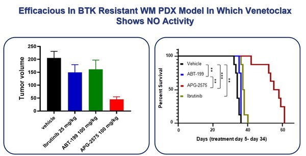 同时,杨大俊博士还指出,临床前数据显示,APG-2575在BTK耐药、Venetoclax 无效的WM PDX模型中显示良好的抑制肿瘤效果(见图3)。这为APG-2575临床适应症的进一步探索提供了基础,显示较大潜力。