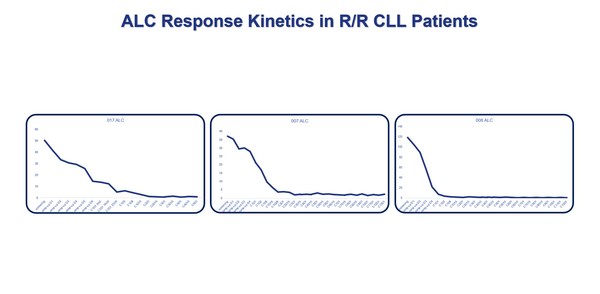 特别是在APG-2575的有效性方面,杨大俊博士强调了两点,一是在重要的有效性指标淋巴细胞绝对数(ALC)方面,3位高风险的入组患者在接受一个周期的治疗之后,ALC指标已经恢复正常的水平(见图1);二是在相较基线的淋巴结体积方面,可评估患者的变化非常明显 (见图2)。