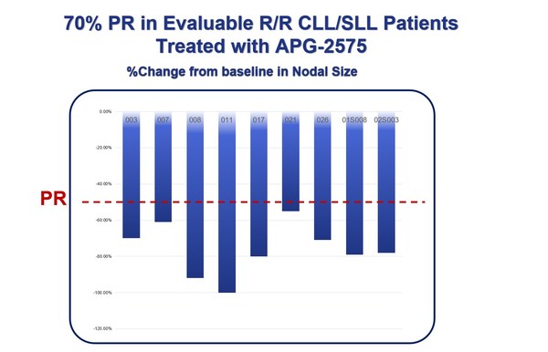 2020年12月,公司已公布APG-2575的最新临床进展:针对复发/难治CLL的临床研究已入组30多位患者,初步临床研究结果显示,在可评估患者中的客观缓解率(ORR)达到70%。这一数据非常令人振奋。在本次摩根大通会议上,杨大俊博士进一步展示了相关数据。