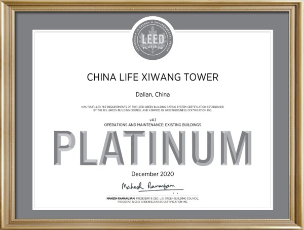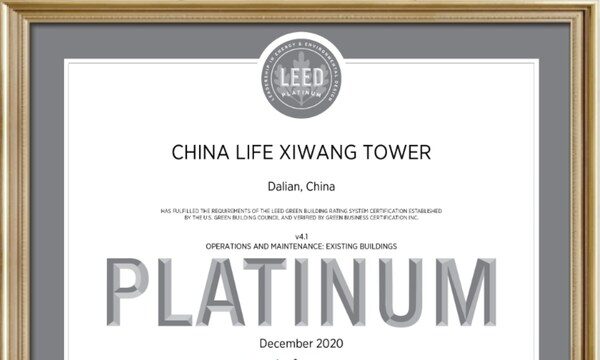 大连2021年1月14日 /新闻稿网 - Xinwengao.com/ — 近日,大连城市地标——中国人寿希望大厦以高分获得由美国绿色建筑委员会(USGBC)颁发的LEED 建筑运营与维护铂金级认证,成为“国寿金融中心”(CLFC)旗下第四栋拥有LEED认证的写字楼,也是东北地区首个通过LEED建筑运营与维护铂金级认证的写字楼。
