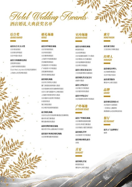 本届“酒店婚礼大典”榜单共计20个奖项,囊括婚礼场地、婚礼服务、婚礼喜宴、婚礼策划、婚礼用品、蜜月旅行6大板块,经过行业专家、酒店人、媒体及读者的评选和投票,最终55个婚礼机构和个人获得殊荣。获奖榜单及机构于“酒店婚礼微信订阅号”及50家门户网站、门户APP等渠道进行媒体宣传,将获奖酒店及机构全方位地推向受众。