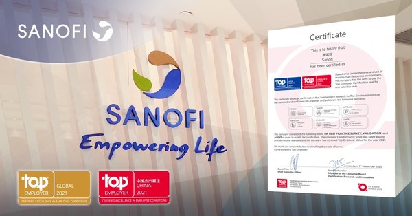 上海2021年1月25日 /新闻稿网 - Xinwengao.com/ — 今天,赛诺菲中国凭借其在人才发展、人才关爱、数字赋能和企业社会责任等领域的积极投入和不断创新,从上千家参选企业中脱颖而出,连续第四年荣膺 “中国杰出雇主”认证并首次荣登榜首。