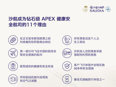 APEX 首席执行官 Joe Leader 博士则说:“ 继成为2021年 APEX 五星级航空公司之后,沙航现在已经达到了钻石级医院级别的健康安全水平,为每位客户带来了福音。”