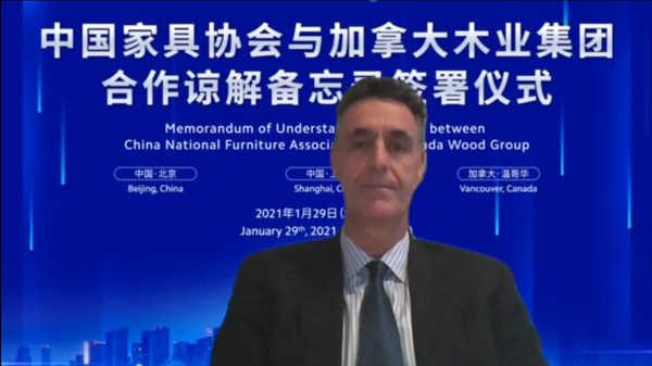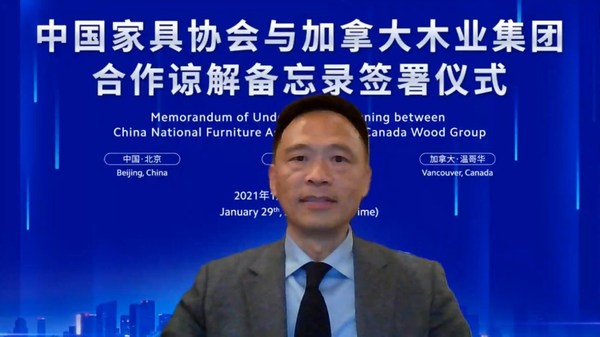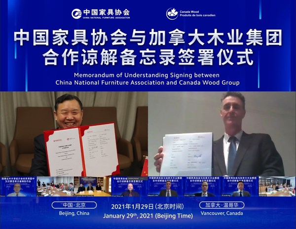 北京2021年1月29日 /新闻稿网 - Xinwengao.com/ — 北京时间2021年1月29日,中国家具协会与加拿大木业集团,通过网络平台,在北京、上海、温哥华三座城市,在加拿大驻华大使馆代表的见证下,成功举行了谅解备忘录云签约仪式。出席签约仪式的领导和嘉宾有:中国家具协会理事长徐祥楠先生,加拿大木业集团总裁布鲁斯·圣约翰先生,加拿大驻华大使馆公使白静芳女士,中国家具协会副理事长张冰冰女士,中国家具协会副理事长兼秘书长屠祺女士,加拿大木业集团执行总监保罗·纽曼先生,加拿大木业中国区执行总裁黄华力先生,加拿大驻华大使馆二等秘书兼商务专员赵梦雪女士,加拿大木业中国区市场开发高级总监王笑竹先生,加拿大木业中国区市场开发总监毛林海先生,加拿大木业中国区企业传讯总监高宇翔先生,加拿大BC省林业创新投资中国代表处政府合作总监苏钰女士,加拿大驻华大使馆木业、建筑和基础设施商务专员梅开女士。