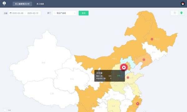 为了更好地帮助企业实时掌控防疫动态,近期,盖雅工场对该功能进行升级,将国家、省、市的官方疫情数据相结合,建立防疫期间的经营地图,通过员工每日健康信息采集,识别各风险员工分布,帮助企业更好地保护员工,同时管控经营风险。GaiaScreen(健康上报)自上线以来,已帮助80家盖雅客户实现员工健康监测,助力疫情防控。