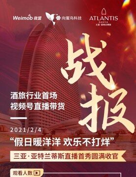 广州2021年2月5日 /新闻稿网 - Xinwengao.com/ — 2021年2月4日,向蜜鸟科技作为首个酒旅行业打通微信视频号+小程序的运营服务提供商,为酒旅行业带来一场视频号直播带货的盛宴 — 三亚·亚特兰蒂斯视频号直播首秀。