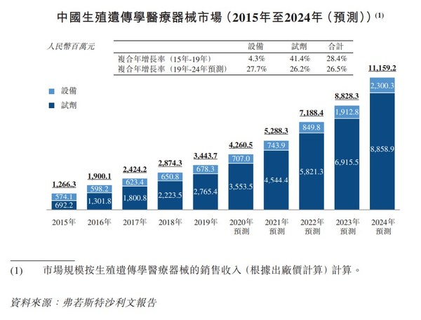 中国每6对夫妇中就有1对生育困难,三代试管资质医疗机构70多家,每年治疗总周期数超过美国一倍多,是全球最大的辅助生殖医疗市场。根据弗若斯特沙利文报告,中国生殖遗传学医疗器械市场在2015年的规模为人民币13亿元,于2019年增长至人民币34亿元,期间复合年增长率为28.4%,并预计于2024年达到人民币112亿元。