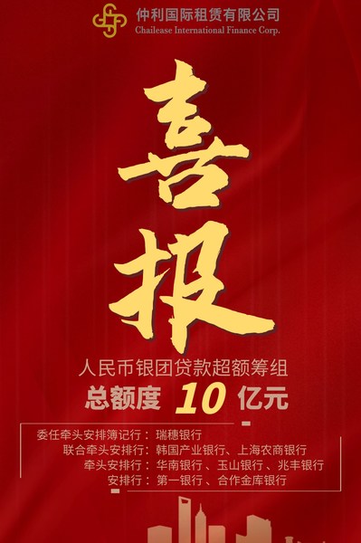 上海2021年2月9日 /新闻稿网 - Xinwengao.com/ — 2021年2月8日,仲利国际租赁有限公司子公司仲利国际贸易(上海)有限公司完成2年期人民币10亿联合授信案。本次联贷案共8家银行参与,由瑞穗银行牵头安排;联合牵头安排行有韩国产业银行、上海农商银行;牵头安排行包括华南商业银行、玉山银行、兆丰国际商业银行;安排行有第一商业银行、合作金库商业银行。
