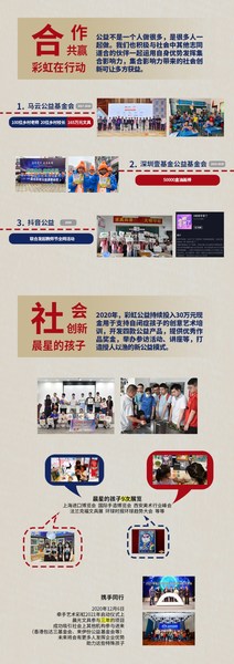 晨光彩虹公益连续三年携手马云公益基金会,2020年向100位乡村教师与20位乡村校长提供了价值165万元的文具。2019年,晨光彩虹公益与壹基金达成合作,为孩子们提供生活学习物资,穿暖吃饱的同时也能够尽情挥洒创意。此外,晨光彩虹公益还与抖音公益、香港包达三基金会、来伊份公益基金会等达成合作,未来将集结更多社会力量,助力慈善公益事业。