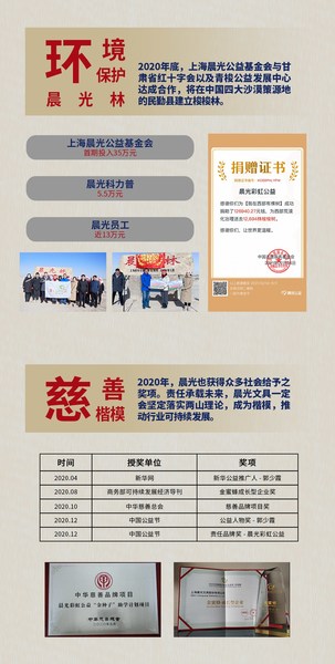 晨光彩虹公益致力与政府、社区及非政府组织携手,开展慈善公益事业,促进社会融合及发展,2020年更是取得了不菲的成绩:共计捐出600余万元文具及善款,彩虹创意教室增至30间,其中涵盖了金种子计划、马云乡村教师计划、壹基金温暖包计划、晨星的孩子、春蕾计划、晨光心、晨光林等公益项目。