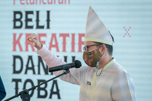 印尼旅游与创意经济部部长Sandiaga Salahuddin Uno周六(2021年2月20日)在北苏门答腊黛丽县(Dairi)德庞旅游度假村(Debang Resort)举行的Beli Kreatif Danau Toba政策发布会上
