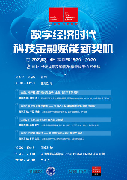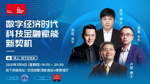 上海2021年3月2日 /新闻稿网 - Xinwengao.com/ — 看金融巨变,探未来趋势。2021年3月4日,法国里昂商学院落地蓉城,与西南财经大学金融学院强强联手,结合两大院校优势、特邀金融领域专家学者及行业资深人士,带来2021年又一重磅论坛。论坛将以线下+线上双会场形式,为全球观众揭开神经网络的黑盒子、一同品读数字经济时代下的五大趋势,探索资产革命,并开启对去中心化区块链加密应用的价值探讨。同时,参与此次线下活动,将获得3月5日中国数字化年会里昂直通车门票,无需付费,即可参与数字化盛会。