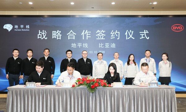 深圳2021年3月3日 /新闻稿网 - Xinwengao.com/ — 在比亚迪完成对汽车智能芯片企业地平线的战略投资之后,地平线与比亚迪于3月2日上午在深圳比亚迪总部举行战略合作签约仪式。依托比亚迪深厚的智能化技术积淀和深度的垂直整合能力,与地平线领先的汽车智能芯片及算法能力,双方将形成强强联合的矩阵,共同推进科技研发层面的纵深探索,加速攻坚和布局智能驾驶前沿技术,加速智能汽车的研发与量产落地。