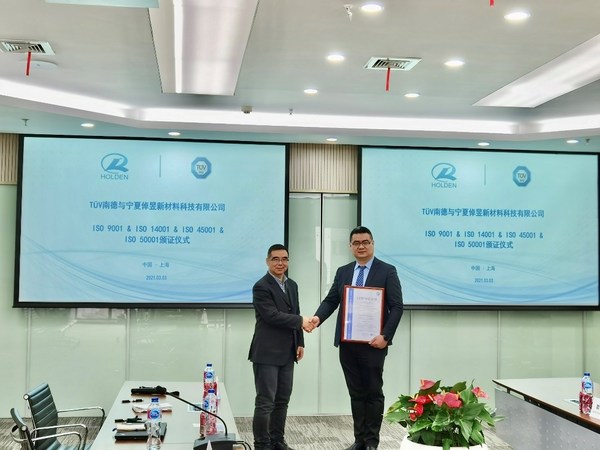上海2021年3月5日 /新闻稿网 - Xinwengao.com/ — TUV南德意志集团(以下简称“TUV南德”)向宁夏倬昱新材料科技有限公司(以下简称“宁夏倬昱”)颁发ISO 9001:2015 、 ISO 14001:2015、ISO 45001:2018 、 ISO 50001:2018涉及质量、环境、职业健康安全、能源管理体系认证证书,并于TUV南德大中华区总部举行颁证仪式。宁夏倬昱是上海浩登材料股份有限公司在宁夏的重要生产基地,此次宁夏倬昱获得四大ISO标准的整合管理体系认证证书,有力地证明了宁夏倬昱在防范缺陷、控制质量波动和用能效率等方面向着业内更高标准迈出了坚实的一步,同时,对于宁夏倬昱积极推进海内外市场有着重大的意义。