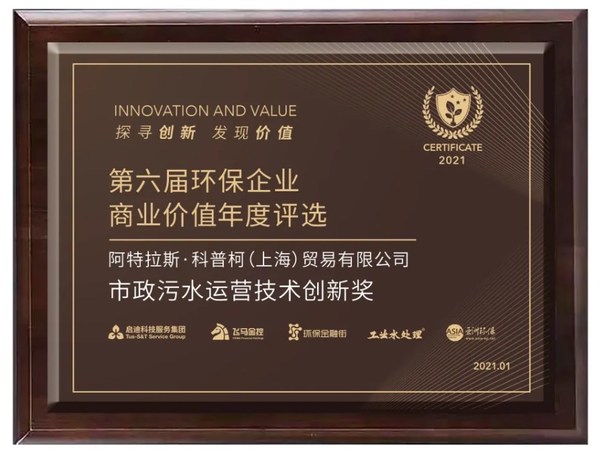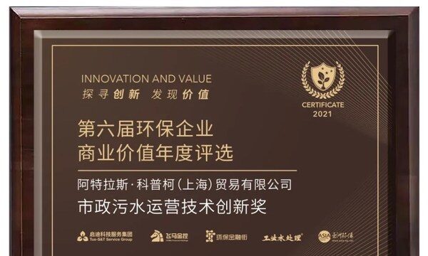 上海2021年3月10日 /新闻稿网 - Xinwengao.com/ — 2021年2月,阿特拉斯·科普柯凭借创新高效的鼓风机、低压压缩机产品系列和专注于市政污水处理的压缩空气系统化解决方案,因其良好的品牌影响力以及公众综合评价,在2021(第六届)环保企业商业价值年度评选中荣获“2021市政污水运营技术创新奖”。