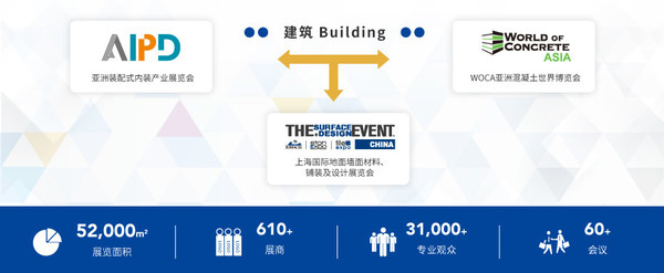 SURFACES China上海国际地面墙面材料、铺装及设计展览会旗下涵盖SURFACES表面铺装材料展、 StonExpo石材展、TileExpo建陶展三个专业建材展,以及AIPD亚洲装配式内装产业展览会和WOCA亚洲混凝土世界博览会将同期举办,三展联动,充分发挥协同效应,打造集“建筑装饰材料、表面铺装材料、装配式装修、建筑及室内设计”于一体的整合建筑装饰材料商贸平台。