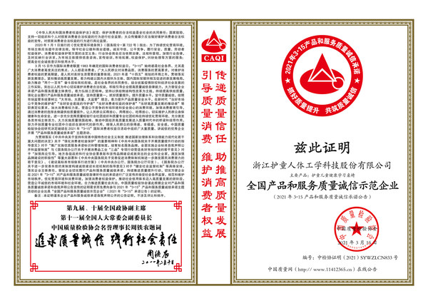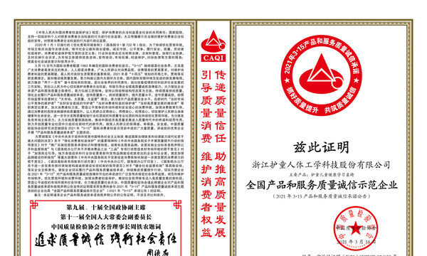 荣誉是肯定,也是期许。消费者权益保护在315,护童的专业贴心守护在365。护童的高品质来源于精益制造、标准设计,更是源自“护童”责任驱使下对填补、完善行业标准的追求。“诚信为本,品质至上”,是一种承诺,更是一份责任。日复一日、年复一年的坚守,才能不负护童初心,实现“让每一个学龄儿童拥有合身桌椅”的使命。