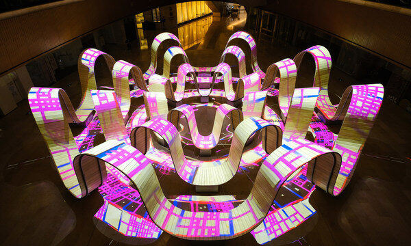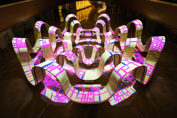 《请就座》(Please Be Seated),由英国皇家艺术学院的明星设计师保罗·考克赛兹(Paul Cocksedge)创作而成,在伦敦设计节中首次亮相。它最初的灵感来自一幅描绘城市广场熙攘人潮的速写,表达了对繁忙都市生活的回应。装置的曲线象征每天的流动与静止,创造出不同空间让人们可以穿梭其中、或是坐下来享受片刻宁静。正如本次活动的主题“万物皆流,留为此刻”,在快节奏的时代背景下,万事万物无时无刻都在变化,而人们在繁忙的生活中主动选择为此刻停留,便是对生活最大的赞美与成就。