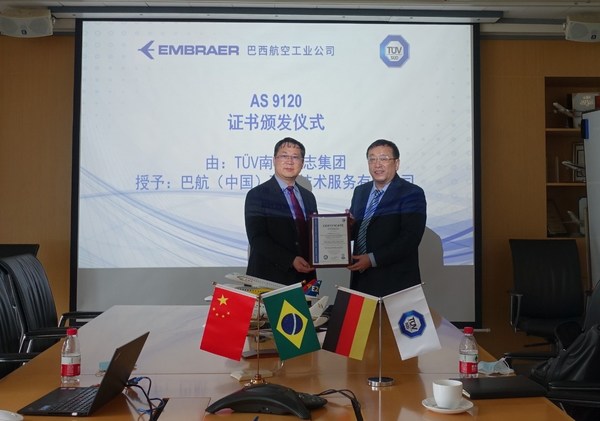 北京2021年3月31日 /新闻稿网 - Xinwengao.com/ — 近日,巴西航空工业公司(以下简称“巴航工业”)在中国的全资子公司巴航(中国)飞机技术服务有限公司(以下简称“巴航中国”)经过TUV南德意志集团(以下简称“TUV南德”)的严格审核,通过了国际航空质量管理体系AS9120的认证。双方于3月30日在北京举办了颁证仪式,并达成长期战略合作的意向。此次获得AS9120认证表明了巴航中国在航空领域能够为客户提供优质产品与服务的承诺,为其拓展国际市场、参与国际市场的竞争奠定了坚实的基础。巴航工业大中华区首席运营官许世新先生、TUV南德管理服务部高级经理田伟先生等出席了证书颁证仪式。