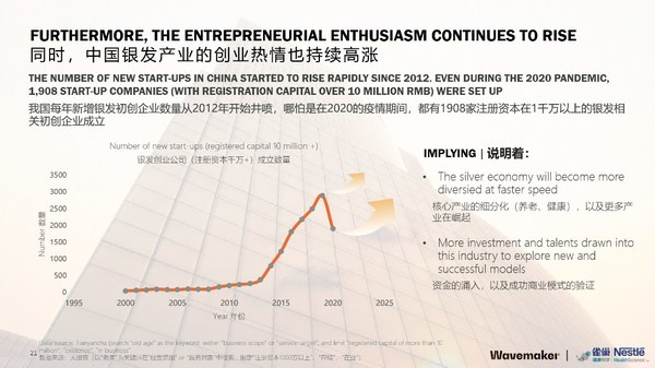 一场突然其来的新冠肺炎疫情,让很多行业都受到了重创挑战,公众的健康观念也随之上升到了新的高点。通过对中国一至三线城市三代银发族的调查显示,在“健康中国”战略和中国特有优势的作用下,整个银发产业呈现出蓬勃发展的势头。中国银发产业在政策趋势、产业结构、推动力方面呈现出三大变化。此外,2020年新增注册资本在千万人民以上的银发产业相关的初创公司数量达到1900多家。2021注定成为中国银发产业发展里程碑式的起点。