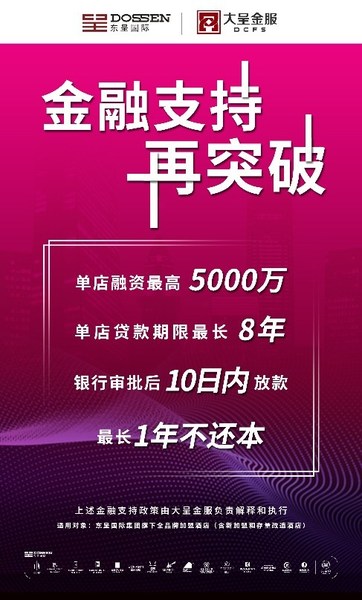 大呈金服还对其个人融资产品 — 呈优贷进行了升级,酒店股东最高可申请300万,可满足酒店租金支付、经营周转等流动资金需求;并同时推出“在营酒店200万融资补贴计划”,直接给予融资费用减免,不断降低融资成本。