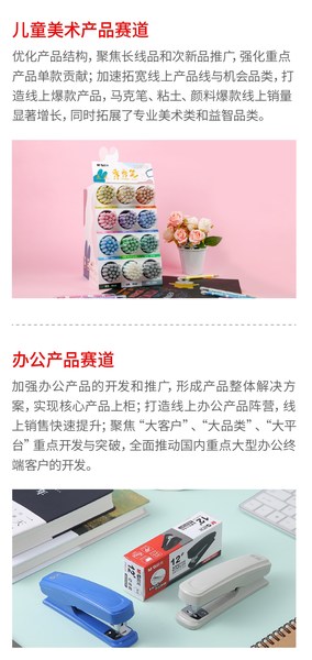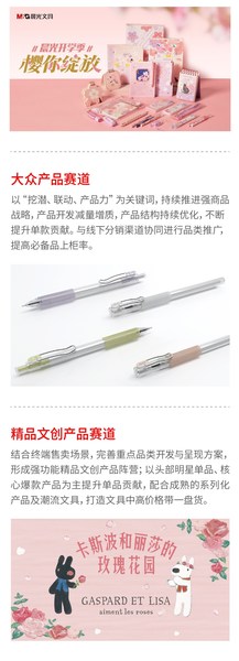 结合终端售卖场景,完善重点品类开发与呈现方案,形成强功能精品文创产品阵营;以头部明星单品、核心爆款产品为主提升单品贡献,配合成熟的系列化产品及潮流文具,打造文具中高价格带一盘货。