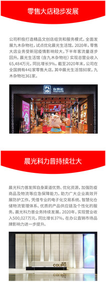 晨光零售大店在过去一年稳步发展,积极打造精品文创店组货和服务模式,全面发展九木杂物社,试点优化晨光生活馆。2020年,零售大店业务受新冠疫情影响较大,下半年客流量逐步回升。晨光生活馆(含九木杂物社)实现总营业收入65,484万元,同比增长9%。截至2020年末,公司在全国拥有441家零售大店,其中晨光生活馆80家,九木杂物社361家。