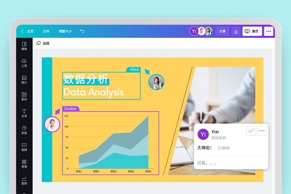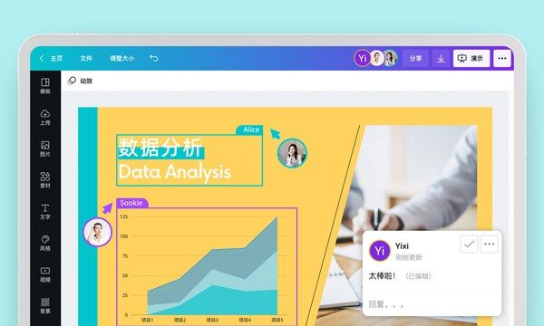 Canva可画是将整个设计过程整合在一起的平台,它使得各行各业、各种规模的团队和工作场所都能轻松通过设计和视觉传播,实现其目标,提高生产力,并保持品牌的一致性。在演示产品上,Canva可画为现代工作场所推出了一系列内容和功能:有包括商业计划、创业融资、工作报告、产品演示等在内的模板;有“会说话”的有声演示文稿;团队成员还可以跨平台查看、修改演示,在任何地方创建、分享和评论团队工作;Canva可画大量的图表和信息图,则简化了数据叙述,能帮助用户将可视化的信息整合到演示文稿中。