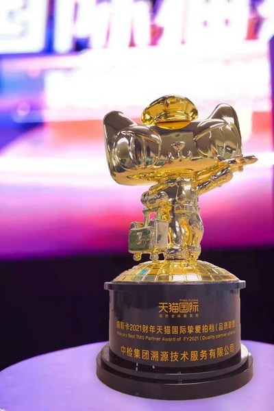 杭州2021年4月12日 /新闻稿网 - Xinwengao.com/ — 3月25日,天猫国际平台年度最高级别活动“天猫国际2021全球合作伙伴盛典”在杭州举行,中检集团溯源技术服务有限公司(以下简称中检溯源)受邀参加,并获得“2021财年天猫国际挚爱拍档奖”。